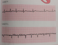 ATRIAL FIBRILLATION   WHEN THE ATRIAL MUSCLE FIBRES CONTRACT INDEPENDENTLY THERE ARE NO (P WAVES) ON THE ECG, ONLY AN IRREGULAR LINE. AT TIMES THERE MAY BE FLUTTER- LIKE WAVES FOR 2-3 SEC. THE AV NODE IS CONTINUOUSLY BOMBARDED WITH DEPOLARIZATION WAVES OF VARYING STRENGTH  AND DEPOLARIZATION SPREADS AT IRREGULAR INTERVALS DOWN THE HIS BUNDLE. THE AV NODE CONDUCTS IN AN "ALL (OR) NONE" FORMATION, SO THAT THE DEPOLARIZATION WAVES PASSING INTO THE HIS BUNDLE ARE CONSTANT INTENSITY. HOWEVER, THESE WAVES ARE IRREGULAR  AND THE VENTRICLES THEREFORE CONTRACT IRREGULARLY. BECAUSE CONDUCTION INTO AND THROUGH THE VENTRICLES IS BY THE NORMAL ROUTE, EACH QRS COMPLEX IS OF NORMAL SHAPE. FIBRILLATION WAVES CAN AFTER BE SEEN MUCH BETTER IN SOME LEADS [ 2ND AND V1  ] NOTE:  NO P WAVES.              IRREGULAR BASELINE.               IRREGULAR QRS COMPLEXES, RATE VARYING BETWEEN 75/MIN AND 190/MIN.   ...